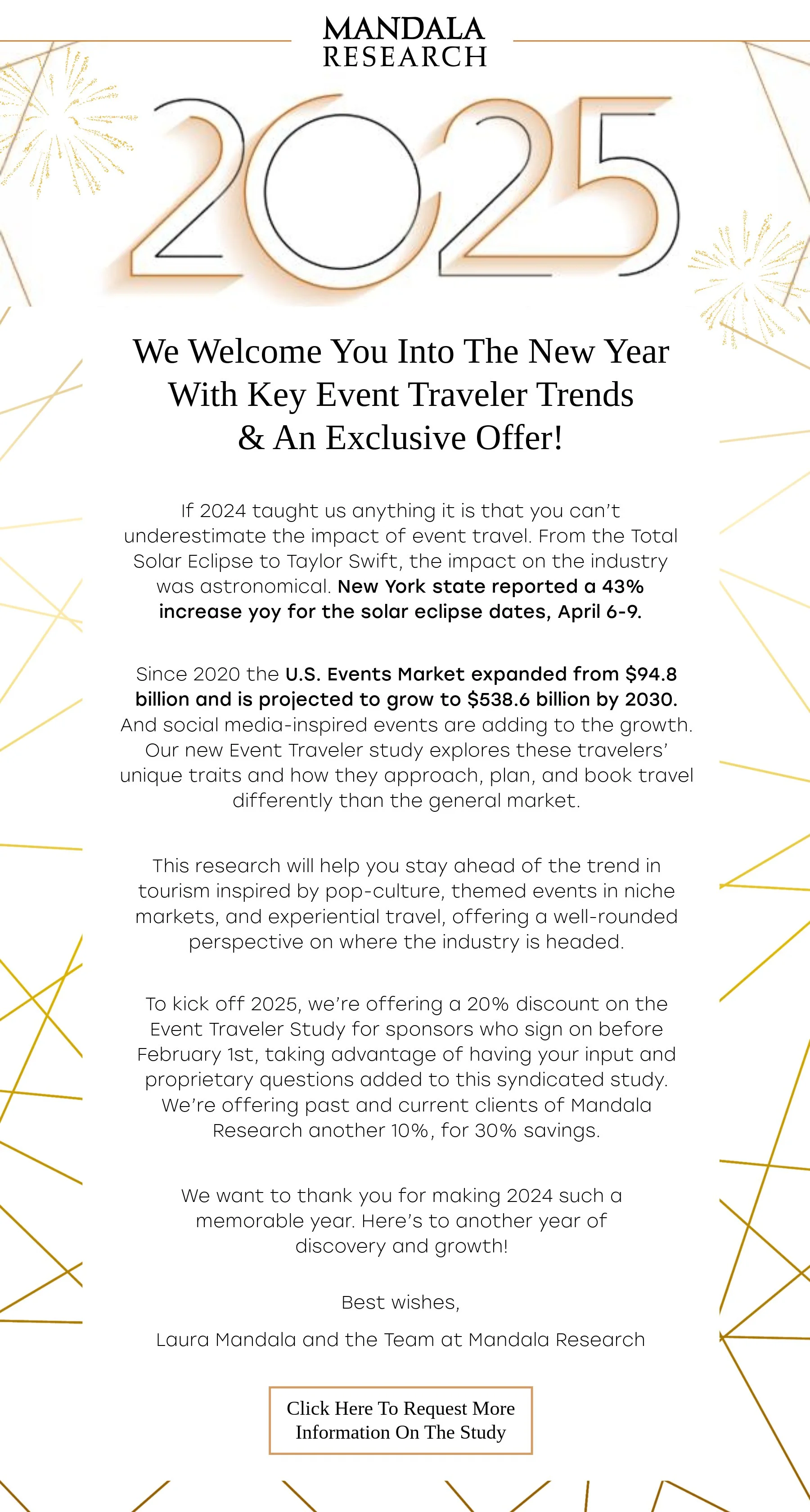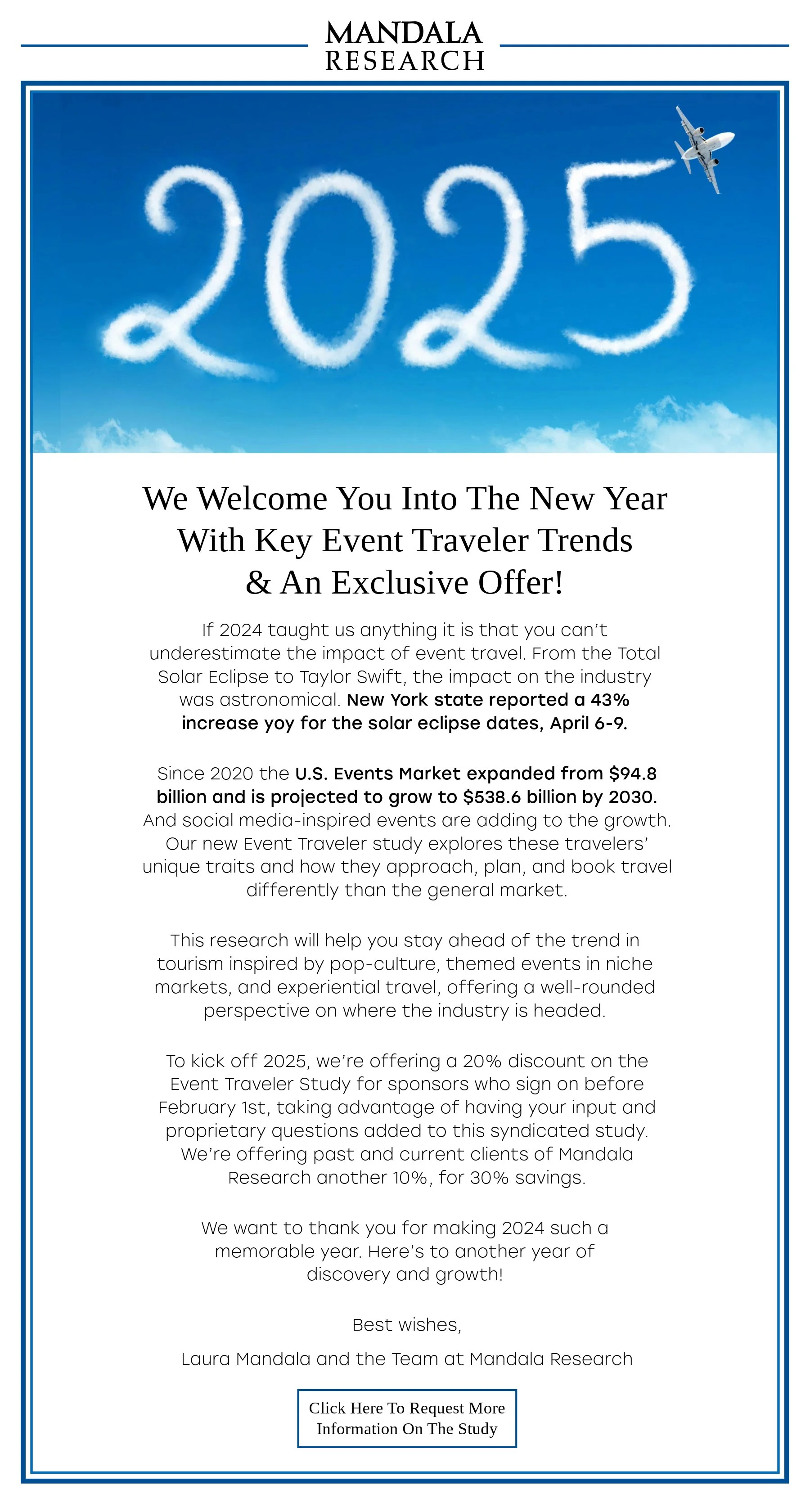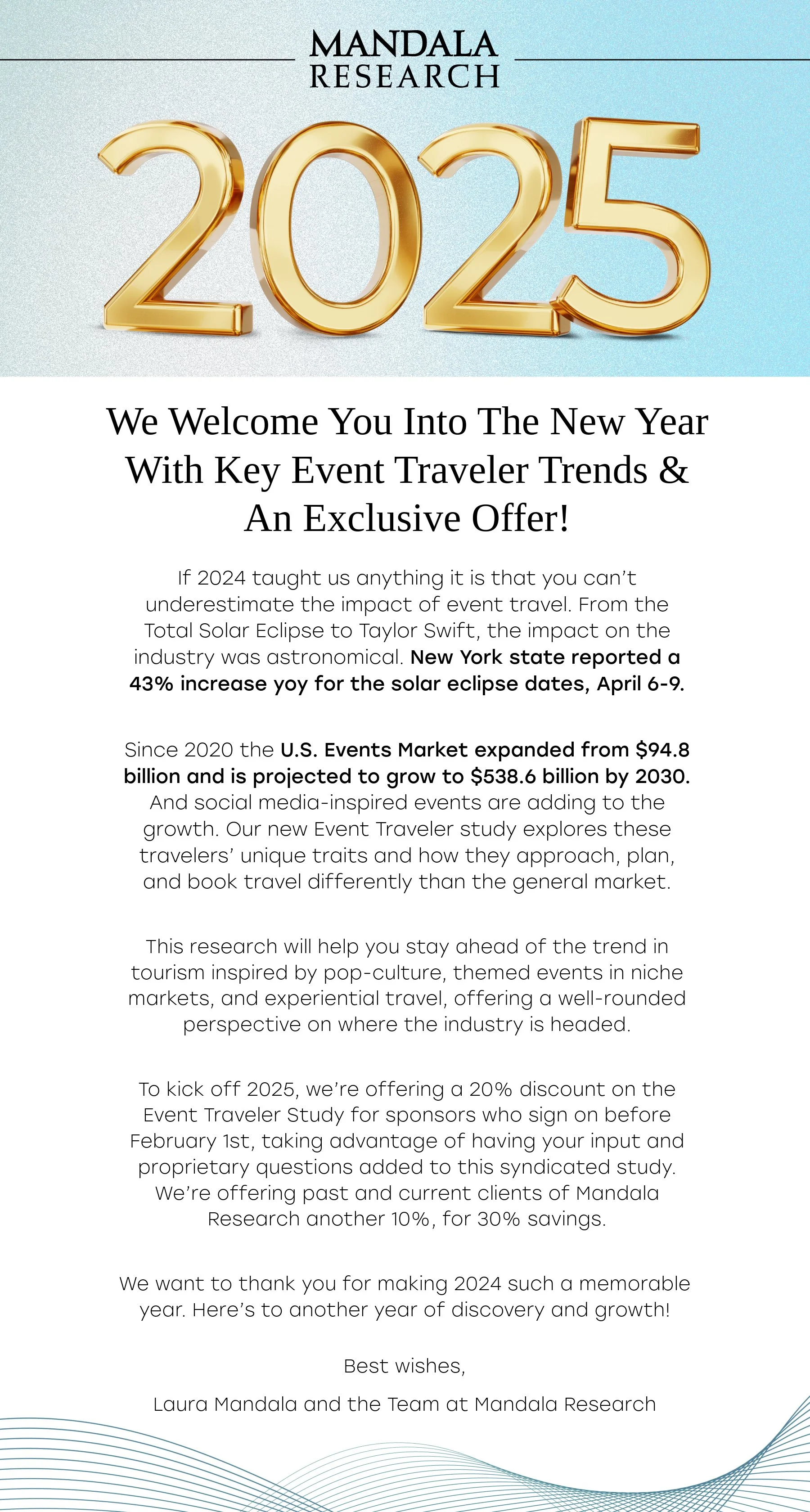 I recently completed a freelance project for Laura Mandala at Mandala Research, designing the 2025 email greeting for her 10,000+ mailing list. The email highlighted key data findings from 2024, introduced a new study on emerging traveler trends, and offered a special discount for sponsors and clients.